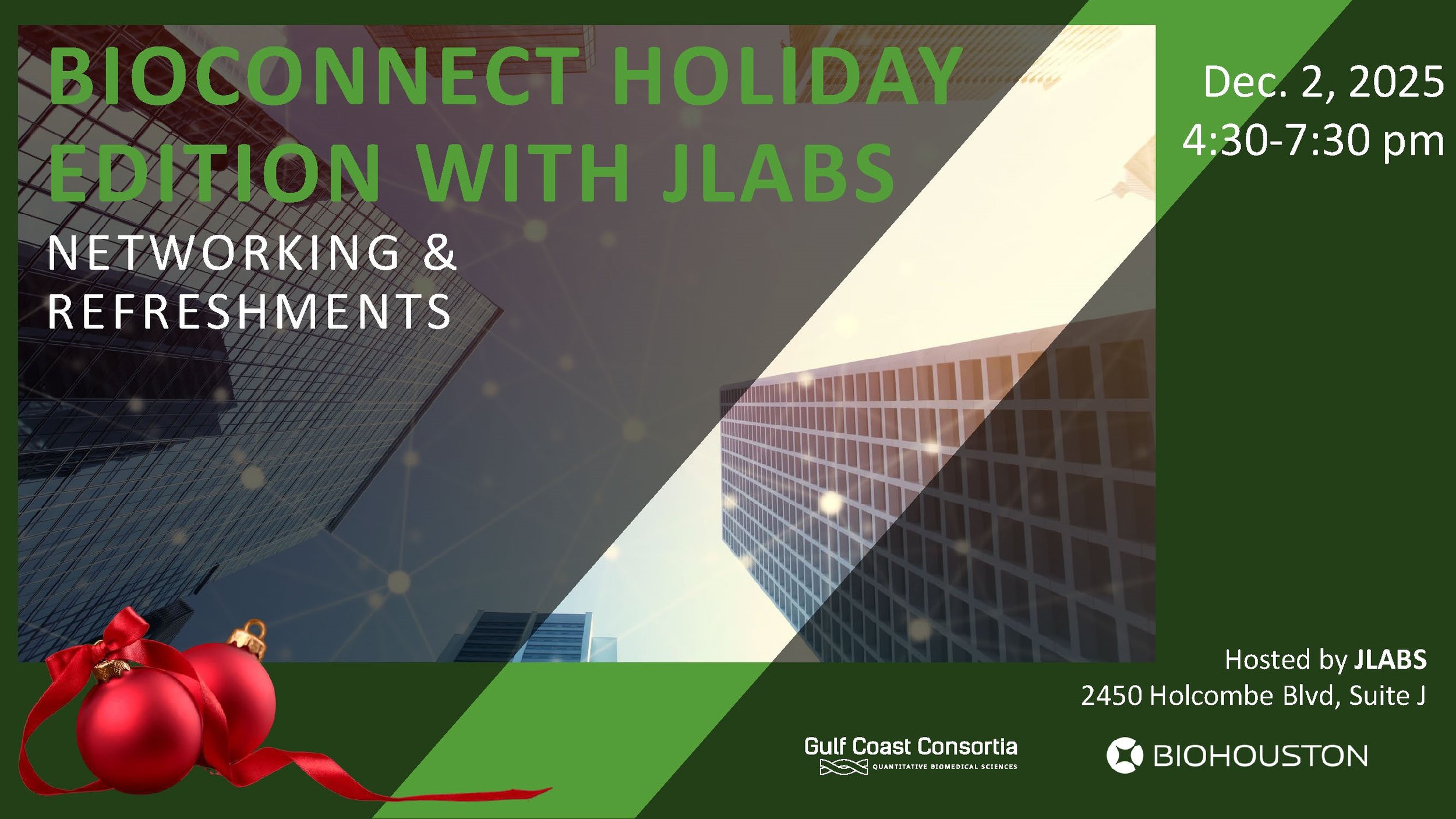 This month's BioConnect will take place on Dec. 2, 2025, from 4:30 to 7:30 pm at Johnson & Johnson at JLABS TMC, 2450 Holcombe Blvd, Suite J. Please click the button below to register. Registration is limited and will close when it reaches capacity or at 11:59 pm on Nov. 28, whichever occurs first.